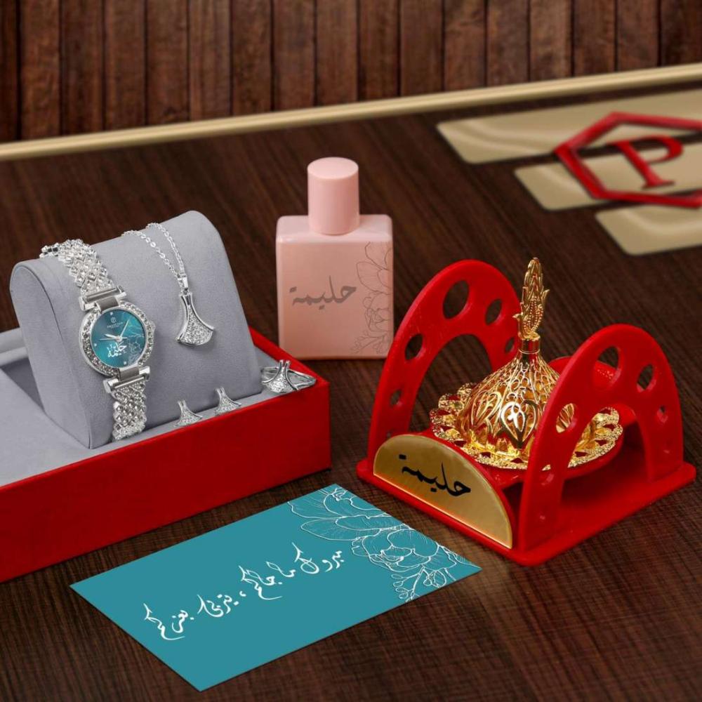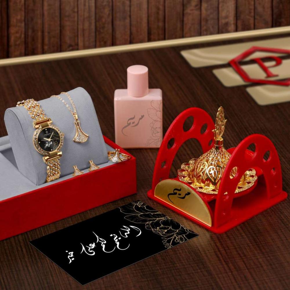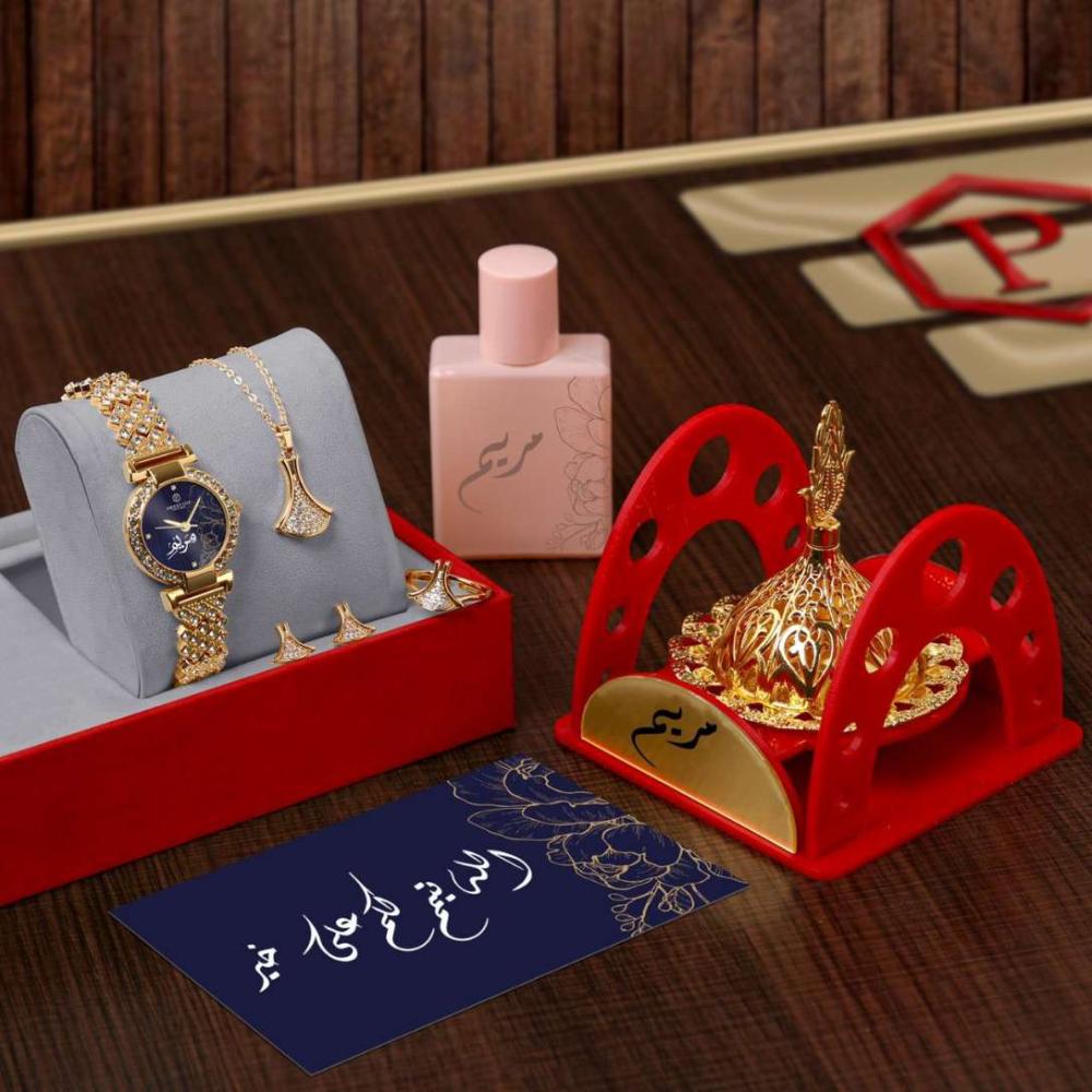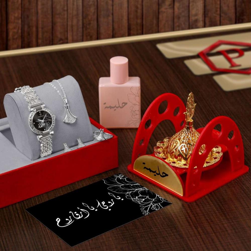 طقم هدايا نسائية مميزة مع ساعة نسائية بالاسم