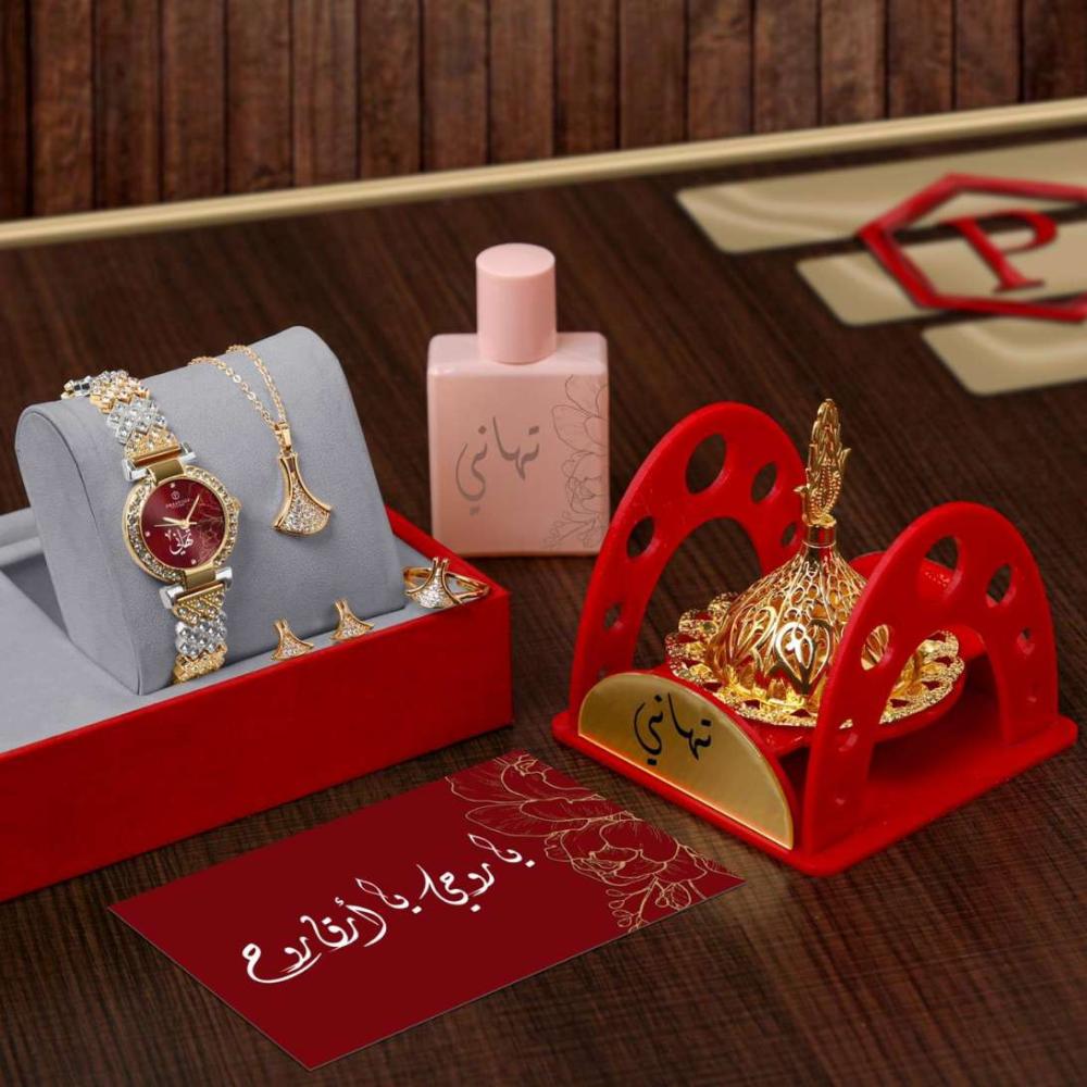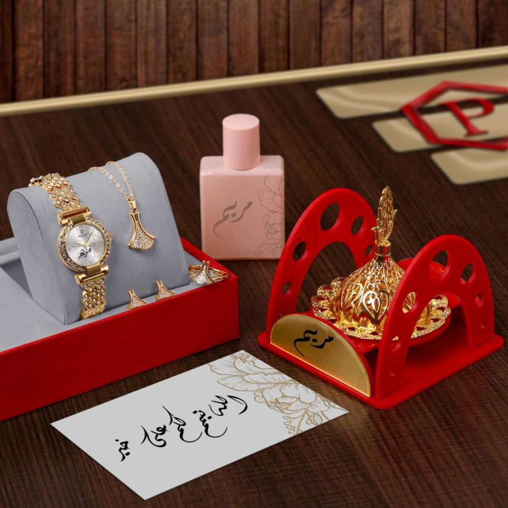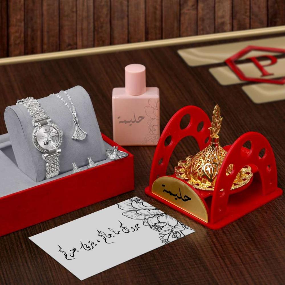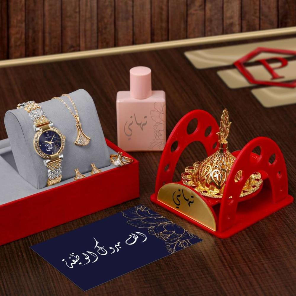 طقم هدايا نسائية مميزة مع ساعة نسائية بالاسم