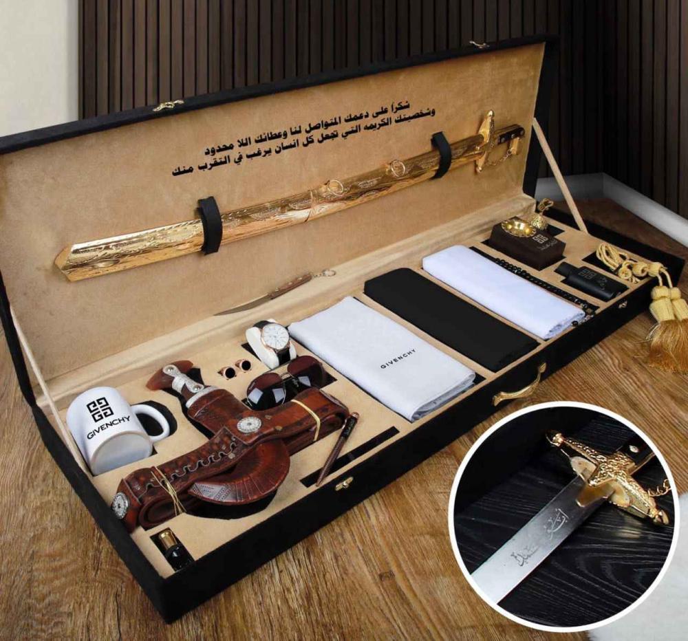 هدية زواج للعريس فخمة تتمثل في بوكس رجالي فاخر يحتوي على مجموعة من العناصر الراقية والمتميزة، بما في ذلك: