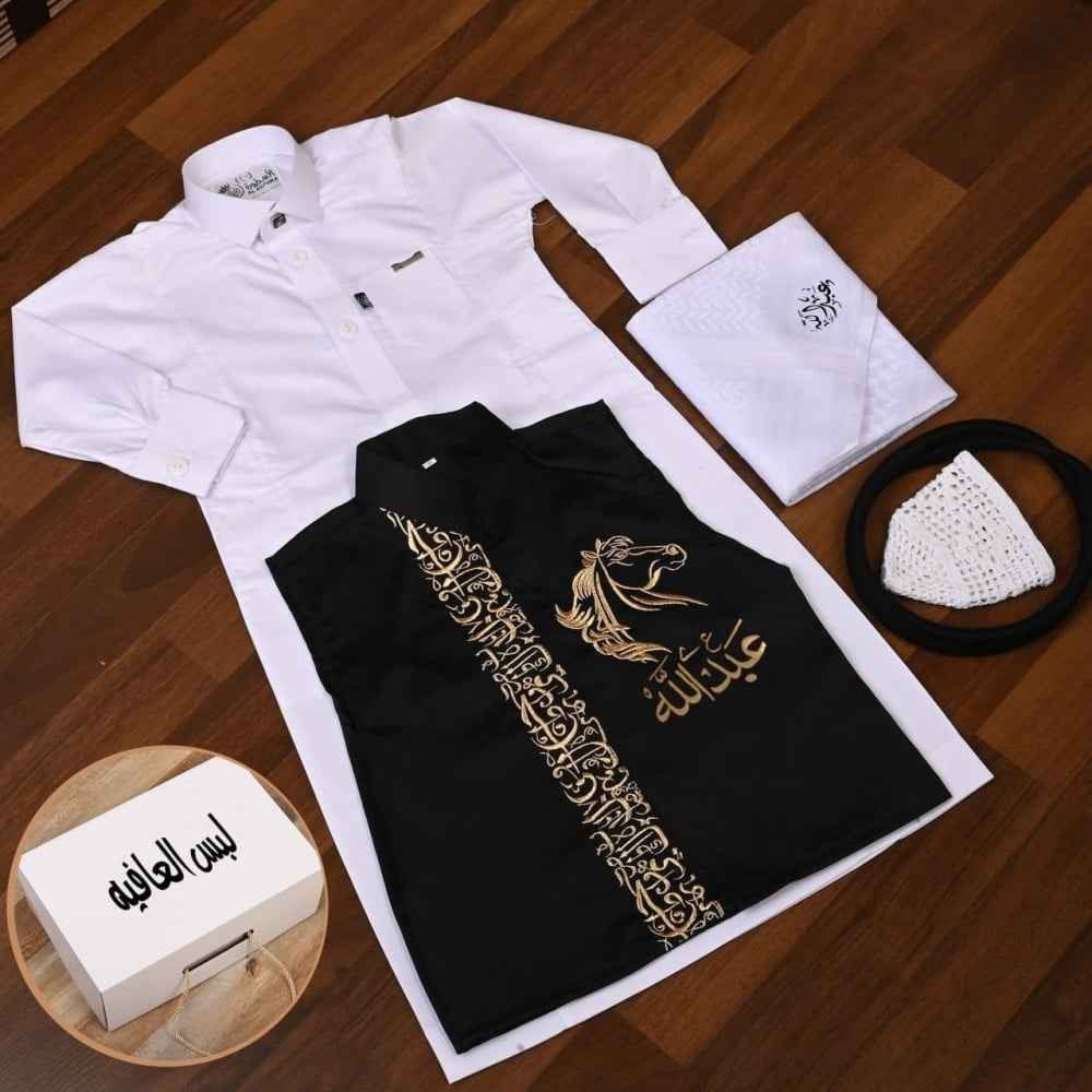 يتكون من ( شماغ اطفال بالاسم - سديري ولادي بالاسم - ثياب ولادي - عقال اطفال طاقيه )